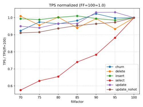 PostgreSQLのfillfactorとパフォーマンスの関係について分析しました。HOT更新以外にも影響があることに要注意です。